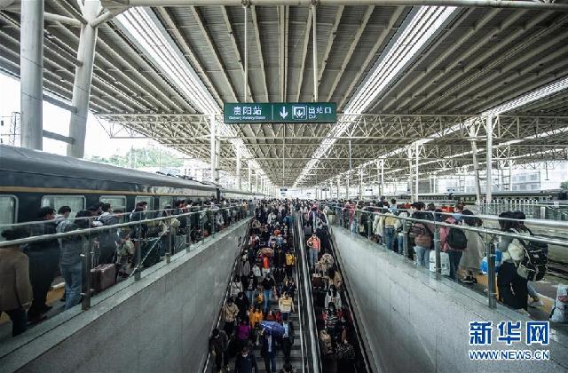 10月7日,長假臨近尾聲,貴陽火車站迎來旅客返程高峰。這是旅客在貴陽火車站準(zhǔn)備出站。新華社記者 陶亮 攝