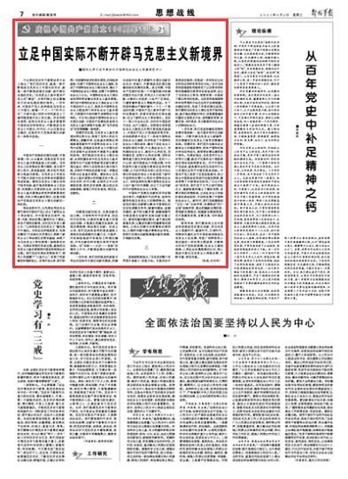 習主席在黨史學習教育動員大會上指出:“我們黨的歷史,就是一部不斷推進馬克思主義中國化的歷史,就是一部不斷推進理論創(chuàng)新、進行理論創(chuàng)造的歷史?!瘪R克思主義是中國共產(chǎn)黨人的“真經(jīng)”,為我們獨立自主掌握自己的命運提供理論指導。一百年來,中國共產(chǎn)黨人堅持推進馬克思主義中國化,破解一個又一個“時代之問”,引領(lǐng)中國人民和中華民族走上了通向強國復興的人間正道。歷史和現(xiàn)實表明,堅持馬克思主義基本原理同中國具體實際相結(jié)合,不斷推進馬克思主義中國化、時代化、大眾化是完全正確的,這是百年大黨推進理論創(chuàng)新的一條根本經(jīng)驗。