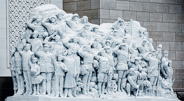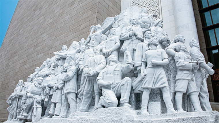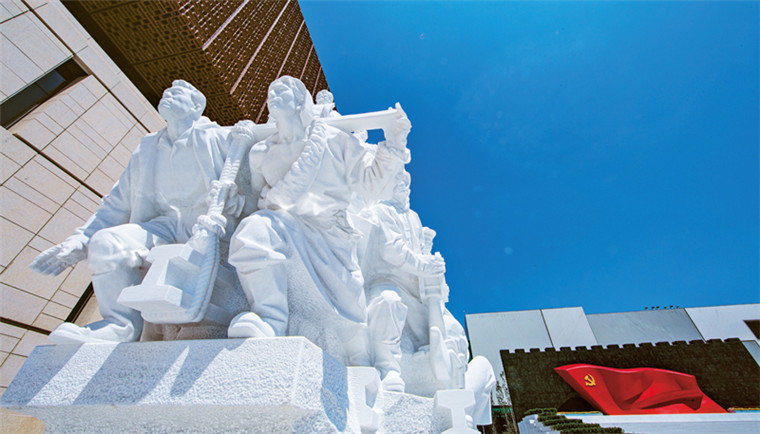 中國共產(chǎn)黨歷史展覽館西側(cè)廣場(chǎng)上矗立的《信仰》、《偉業(yè)》、《攻堅(jiān)》、《追夢(mèng)》四組大型雕塑,分別對(duì)應(yīng)“四個(gè)偉大”主題,276個(gè)人物與583塊漢白玉融為一體,講述著中國共產(chǎn)黨100年來為人民謀幸福、為民族謀復(fù)興的奮斗歷程。雕塑《信仰》中71位不同時(shí)代、不同身份、不同年齡的代表人物莊嚴(yán)宣誓的場(chǎng)景,集中展現(xiàn)了中國共產(chǎn)黨人不忘初心、披荊斬棘、繼往開來,團(tuán)結(jié)帶領(lǐng)全國各族人民朝著實(shí)現(xiàn)中華民族偉大復(fù)興堅(jiān)毅前行的豪情壯志。 劉新武/攝