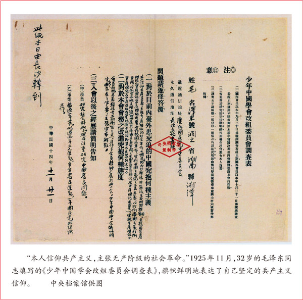 ——“毛澤東同志在青年時期就立下拯救民族于危難的遠大志向……十月革命一聲炮響,給中國送來了馬克思列寧主義。從紛然雜陳的各種觀點和路徑中,經(jīng)過反復比較和鑒別,毛澤東同志毅然選擇了馬克思列寧主義,選擇了為實現(xiàn)共產(chǎn)主義而奮斗的崇高理想。在此后的革命生涯中,不管是‘倒海翻江卷巨瀾’,還是‘雄關(guān)漫道真如鐵’,毛澤東同志始終都矢志不移、執(zhí)著追求。”