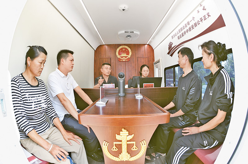 2021年9月1日,一款新式“車載便民法庭”開進重慶市云陽縣鳳鳴鎮(zhèn)五同村,調查、辯論、舉證、質證、打印、簽收可于車內一次性完成,并與機關數(shù)字化法庭實現(xiàn)信息實時傳輸。圖為“車載便民法庭”庭審現(xiàn)場。 中新社發(fā) 饒國君/攝