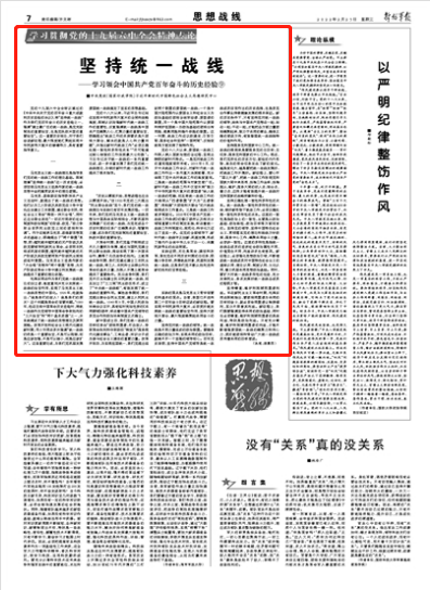 黨的十九屆六中全會審議通過的《中共中央關(guān)于黨的百年奮斗重大成就和歷史經(jīng)驗的決議》,將“堅持統(tǒng)一戰(zhàn)線”作為我們黨百年奮斗的歷史經(jīng)驗之一,強調(diào)“建立最廣泛的統(tǒng)一戰(zhàn)線,是黨克敵制勝的重要法寶,也是黨執(zhí)政興國的重要法寶”。這一重要歷史結(jié)論,對于我們奮進新征程,最大限度地匯聚起實現(xiàn)中華民族偉大復興的磅礴偉力,具有重要指導意義。