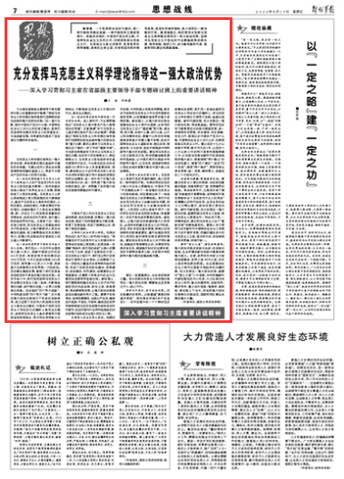 習主席在省部級主要領導干部專題研討班上的重要講話中強調:“擁有馬克思主義科學理論指導是我們黨鮮明的政治品格和強大的政治優(yōu)勢。”這一重大論斷,是對中國共產(chǎn)黨為什么能、中國特色社會主義為什么好的有力揭示,是我們黨堅持和發(fā)展馬克思主義的鄭重宣示,為奮進新征程、奪取新勝利提供了堅實理論支撐和科學指導。