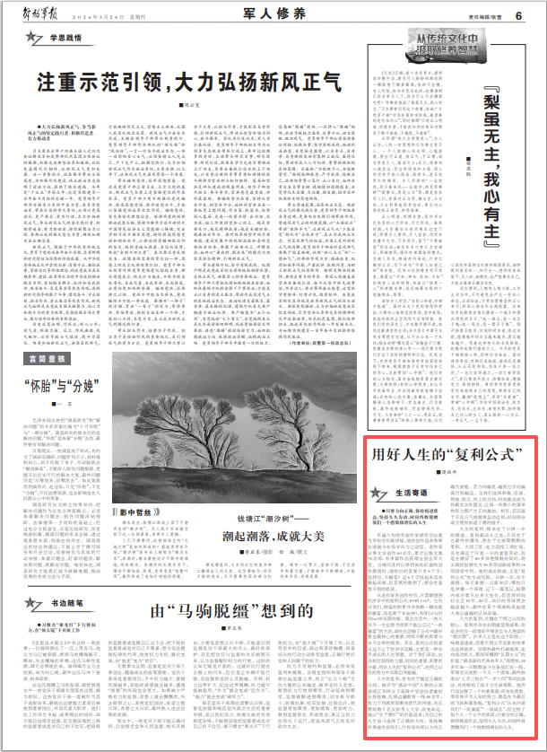 人生的復(fù)利,關(guān)鍵在于持之以恒的耐心。復(fù)利并非在初期就顯現(xiàn)成果,而是會經(jīng)歷一段看似平緩甚至令人絕望的“潛伏期”。許多人正是在這個階段,一味渴望速成,因看不到立竿見影的效果而選擇放棄。而那些最終打破瓶頸、走向成功的人,都深深懂得“長期主義”的價值?!白蠲佬聲r代革命軍人”周勇坤,30多年如一日默默奮斗在備戰(zhàn)打仗一線,帶領(lǐng)官兵戰(zhàn)勝一個又一個困難,最終探索出“七步三結(jié)合”“一步六問”等訓法戰(zhàn)法,有效縮短了戰(zhàn)斗力生成周期。他用行動詮釋了一個樸素真理:所有的煎熬、等待和不為人知的努力,都是在為最后的飛躍積蓄勢能。“復(fù)利公式”從未許諾我們“一夜暴富”“一夜成名”,但它給了每個人一個公平的承諾:只要方向正確,保持精進狀態(tài),堅持久久為功,時間終將饋贈我們一個指數(shù)級增長的人生。