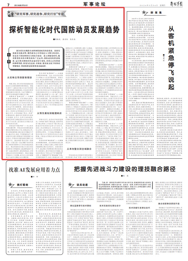 戰(zhàn)爭重在實現(xiàn)排兵布陣和資源配置的最優(yōu)化。最新局部戰(zhàn)爭實踐表明,現(xiàn)代戰(zhàn)爭已不單純是人力物力的對決,更是基于國家整體實力的綜合較量。進入智能化時代,隨著數(shù)智技術(shù)的不斷發(fā)展及廣泛運用,國防動員的要素構(gòu)成、運行模式和組織形態(tài)也在發(fā)生變化,其重心正從資源的物理籌措,轉(zhuǎn)變?yōu)樾畔⒘鳌Q策流、能量流支配下的體系智能響應、資源精準適配和要素高速流轉(zhuǎn)。
