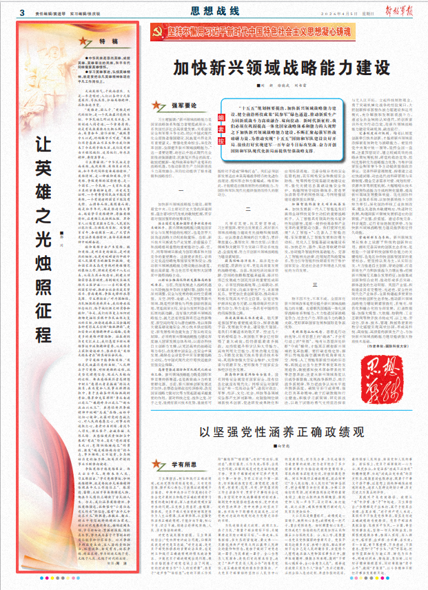 習主席強調:“中華民族是崇尚英雄、成就英雄、英雄輩出的民族,和平年代同樣需要英雄情懷。”英雄情懷,是一種敬仰英雄、學習英雄、爭做英雄的深厚情感,是一個國家、一個民族、一支軍隊長盛不衰的重要精神支撐。歷史反復證明,一個有希望的民族不能沒有英雄,一個有前途的國家不能沒有先鋒。山因脊而雄,屋因梁而固。越是和平年代、越是推進偉大事業(yè),越需學習英雄精神、厚植英雄情懷,讓英雄之光燭照征程。革命軍人以保家衛(wèi)國為己任,人民軍隊以能打仗、打勝仗為目標。攻堅建軍百年、奮進強軍一流,廣大官兵更需涵養(yǎng)英雄情懷,在傳承英雄精神中砥礪奮進。