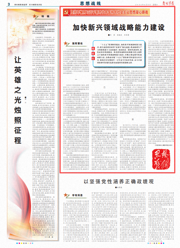 加快新興領(lǐng)域戰(zhàn)略能力建設(shè),凝聚著黨中央、習(xí)主席對歷史大勢的深邃洞察,蘊(yùn)含著對時代先機(jī)的敏銳把握,貫穿著對強(qiáng)國強(qiáng)軍的統(tǒng)籌謀劃。