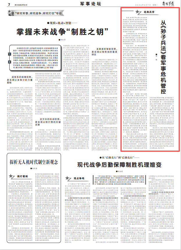 當前,世界百年未有之大變局加速演進,放眼全球,地區(qū)安全熱點問題此起彼伏,局部沖突和動蕩頻發(fā)。由此來看,《孫子兵法》中所蘊含的軍事危機管控思想,涉及軍事危機的預測、預防、化解等諸多方面,或許能為卓有成效地遏制戰(zhàn)爭、維護和平,提供極具價值的“中國方案”。