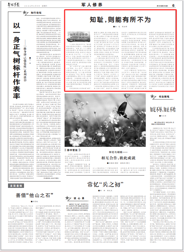“人有恥,則能有所不為?!蹦纤嗡枷爰抑祆涞倪@句箴言,一語道破道德抉擇的要義。知恥,是一個(gè)人自警自省的內(nèi)在修為,更多體現(xiàn)為應(yīng)對(duì)外部世界的挑戰(zhàn)與考驗(yàn),在良知上的進(jìn)與退、取與舍、為與不為。一個(gè)人有了羞恥之心,才能心存戒懼、取舍有度、知止不殆,進(jìn)而明辨是非、有所不為;一個(gè)國家和民族推崇羞恥之心,才能自尊自愛、自強(qiáng)不息,始終保持奮斗姿態(tài)和民族氣節(jié)風(fēng)骨。