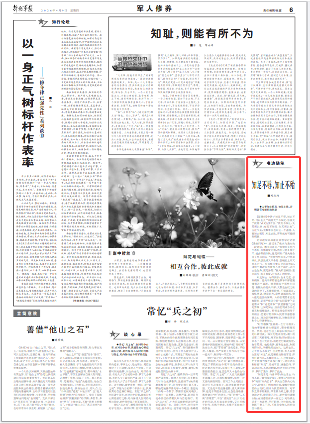 “知足常足,終身不辱;知止常止,終身不恥?!弊龅街阒?,就要從“向外索取”轉(zhuǎn)而“向內(nèi)自求”,多關(guān)注自我內(nèi)心的安寧,珍惜當(dāng)下?lián)碛械男腋?,掌握控制欲望的主動?quán),而非為欲望所奴役。對軍隊(duì)黨員干部來說,須常修為政之德、常思貪欲之害、常懷律己之心,始終保持清醒頭腦,在誘惑面前多一分定力,對物質(zhì)生活多一些淡然,盡好職責(zé),守住底線,做到既干事又干凈,不辜負(fù)黨和人民的信任與重托。