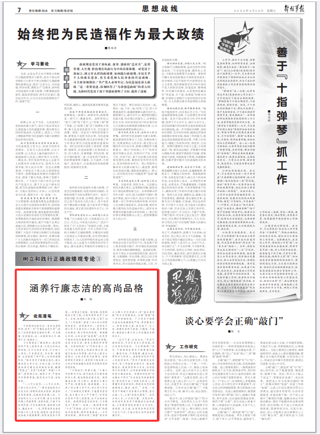 習(xí)主席指出:“廉潔奉公,就是保持共產(chǎn)黨人艱苦樸素、公而忘私的光榮傳統(tǒng),從不以功臣自居,不計(jì)較個(gè)人得失,不貪圖享受,守紀(jì)律、講規(guī)矩,生動(dòng)體現(xiàn)了共產(chǎn)黨人應(yīng)有的道德風(fēng)范?!泵棵h員干部都應(yīng)銘記,清正廉潔是立身之本、從政之基,必須注重涵養(yǎng)行廉志潔的高尚品格,勤撣“思想塵”、多思“貪欲害”、常破“心中賊”,在明辨公私、慎待小節(jié)、嚴(yán)格家風(fēng)中常修常煉,做到泥濘不染、潔如青蓮。