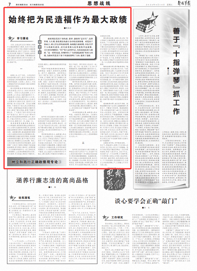 始終把為民造福作為最大政績(jī),這種堅(jiān)定自覺(jué)不會(huì)憑空產(chǎn)生,而是源于初心使命的感召踐行、科學(xué)理論的浸潤(rùn)滋養(yǎng)、躬身實(shí)踐的磨礪鍛造。奮進(jìn)新征程,黨員干部應(yīng)主動(dòng)加強(qiáng)思想淬煉、政治歷練、實(shí)踐鍛煉、專(zhuān)業(yè)訓(xùn)練,使自己的立場(chǎng)更堅(jiān)定、黨性更堅(jiān)強(qiáng)、本領(lǐng)更過(guò)硬、作風(fēng)更務(wù)實(shí),努力創(chuàng)造經(jīng)得起實(shí)踐、人民、歷史檢驗(yàn)的實(shí)績(jī)。