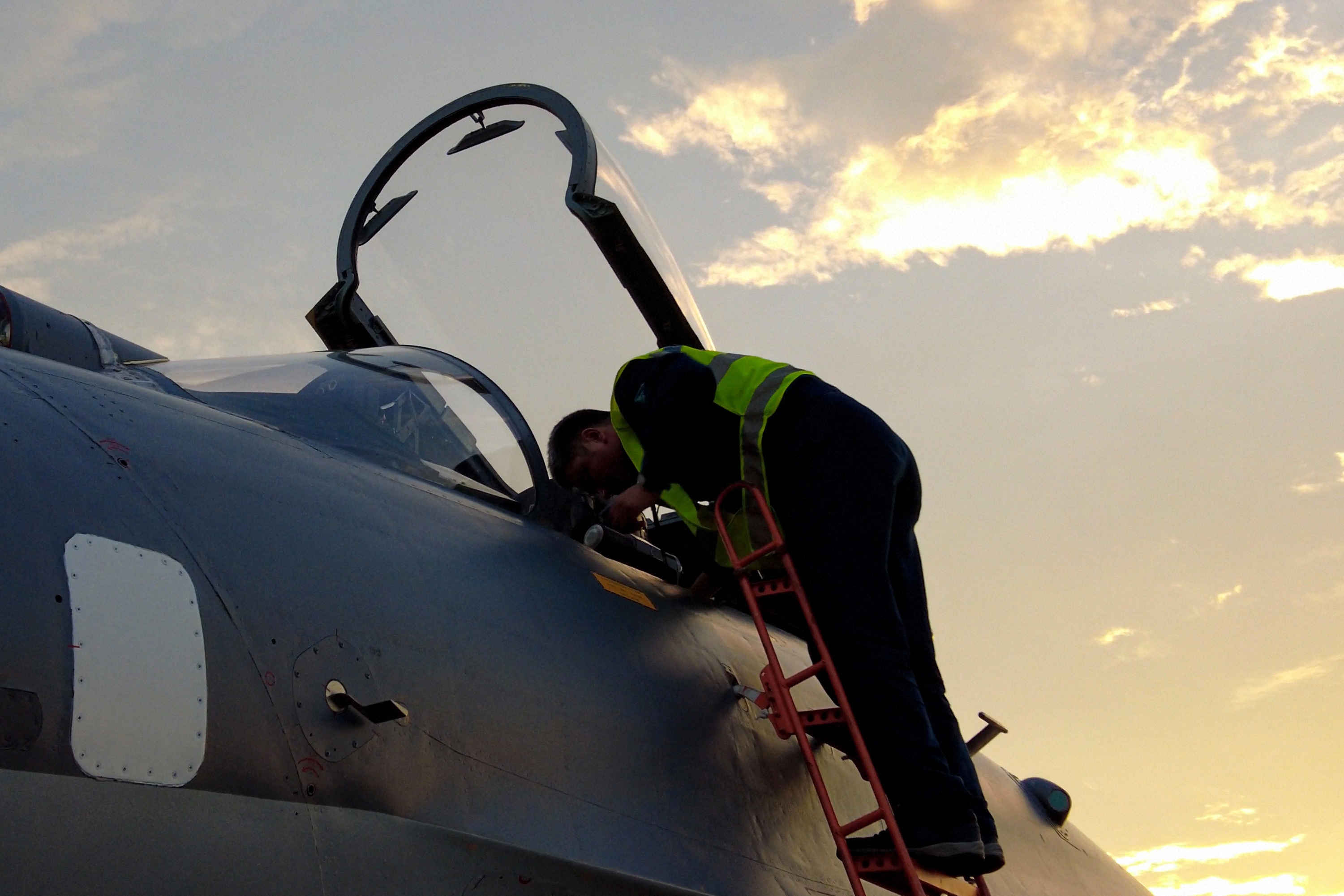 余暉中,機務(wù)保障人員檢查戰(zhàn)機