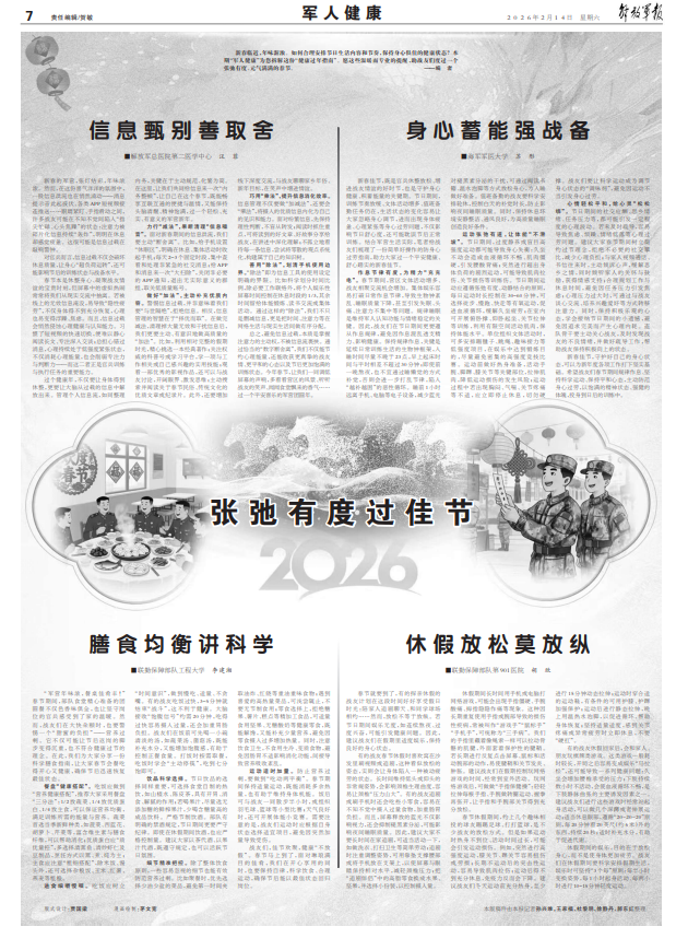 新春臨近,年味漸濃。如何合理安排節(jié)日生活內(nèi)容和節(jié)奏,保持身心俱佳的健康狀態(tài)?本期“軍人健康”為您拆解這份“健康過年指南”。愿這些溫暖而專業(yè)的提醒,助戰(zhàn)友們度過一個(gè)張弛有度、元?dú)鉂M滿的春節(jié)。