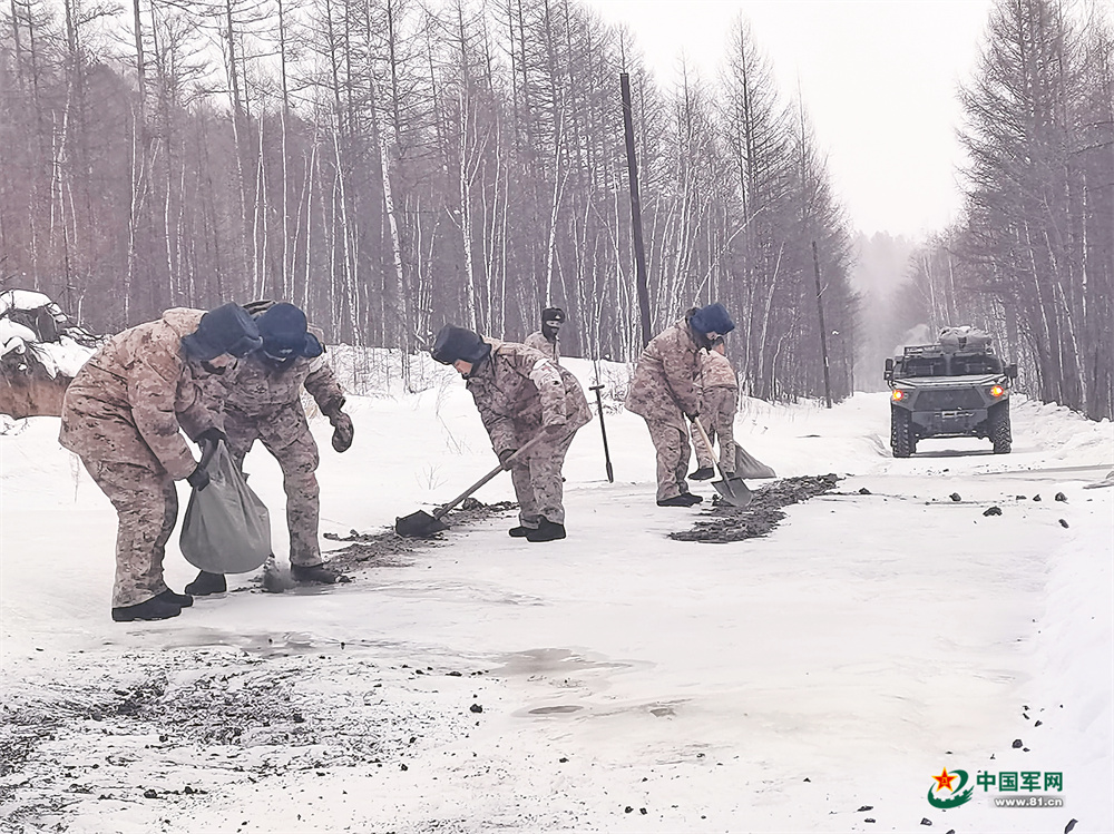 巡診車(chē)再次踏上征途。遇到難以通行之處,隊(duì)員們下車(chē)鋪撒煤灰渣,用鍬鎬、冰釬,一點(diǎn)點(diǎn)鑿出冰道。