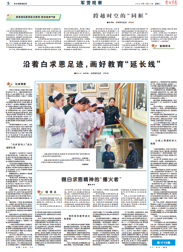 2024年4月,該院勤務(wù)分隊中士邵輝受領(lǐng)任務(wù),與團(tuán)隊一起搜集整理史料,通過錄制微課等鮮活形式,回訪白求恩曾戰(zhàn)斗過的地方,全方位、立體式呈現(xiàn)白求恩精神。