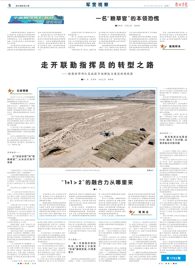 “保障對象從單一到多元、保障行動由平面到立體、保障點位由分散到集中等多種轉(zhuǎn)變,是一項囊括思維理念更新、能力素質(zhì)升級、戰(zhàn)法運用創(chuàng)新等多環(huán)節(jié)多維度的系統(tǒng)工程。”該旅領(lǐng)導(dǎo)介紹說,從頭腦風暴到破解難題,新型“糧草官”闖開了能力升級之路。