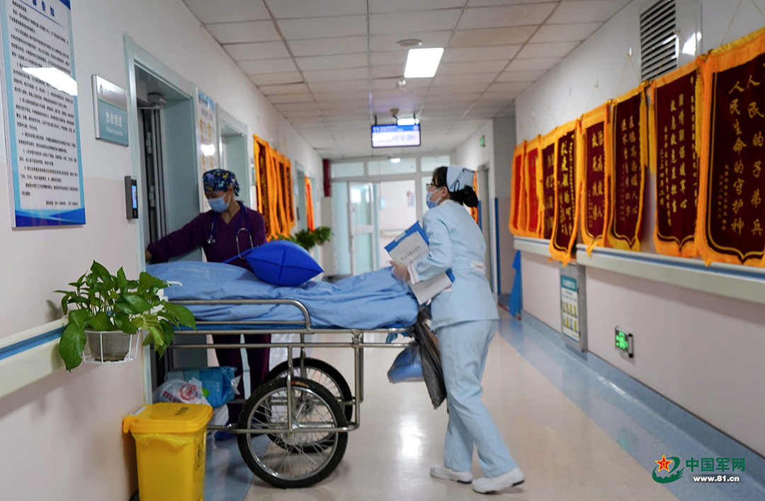 張瑛護(hù)送患者轉(zhuǎn)入重癥監(jiān)護(hù)病房。中國軍網(wǎng)記者 林詩清 攝