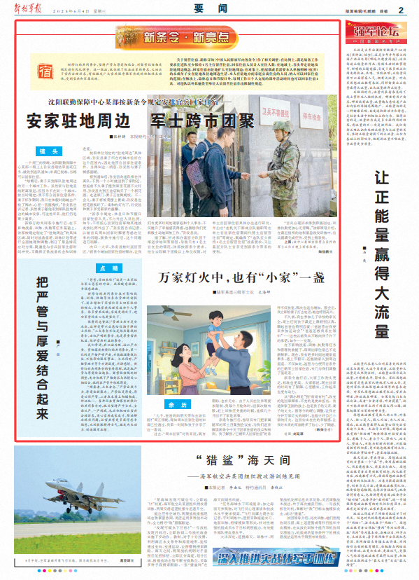 次日一大早,孫安昌按時返回營區(qū)?!靶聴l令增加回家住宿的頻次,讓我們有更多時間處理家庭和個人事務(wù),不僅提升了幸福感獲得感,也激勵我們更積極主動地訓(xùn)練工作。”孫安昌說。