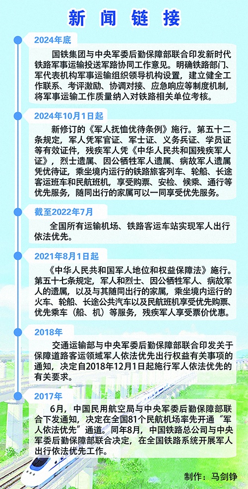 編者按 2017年8月1日,中國(guó)鐵路總公司與中央軍委后勤保障部聯(lián)合決定,在全國(guó)鐵路系統(tǒng)開(kāi)展軍人出行依法優(yōu)先工作。8年來(lái),全國(guó)鐵路系統(tǒng)全面執(zhí)行各項(xiàng)政策措施,形成了“購(gòu)票優(yōu)先、進(jìn)站優(yōu)先、候車(chē)優(yōu)先、乘車(chē)優(yōu)先”常態(tài)保障機(jī)制。不僅如此,他們主動(dòng)對(duì)接部隊(duì)練兵備戰(zhàn)需求,將軍人依法優(yōu)先向戰(zhàn)備訓(xùn)練延伸,逐步構(gòu)建起集兵力投送、裝備轉(zhuǎn)運(yùn)、演訓(xùn)保障于一體的軍事運(yùn)輸服務(wù)體系。近日,本報(bào)記者深入一線采訪,發(fā)回一組反映新時(shí)代“鋼鐵動(dòng)脈”服務(wù)強(qiáng)軍興軍實(shí)踐的現(xiàn)場(chǎng)報(bào)道。