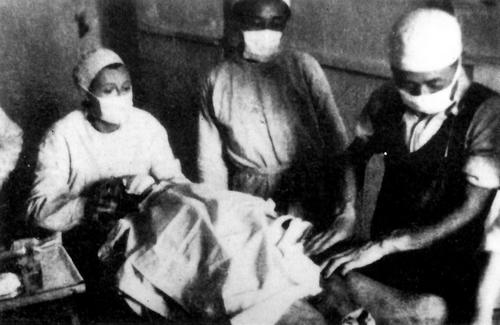 1939年,在安徽省宣城市涇縣云嶺鎮(zhèn),新四軍軍醫(yī)處醫(yī)務主任宮乃泉(右一)與加拿大護士瓊·尤恩(左一)等為戰(zhàn)士做手術,照片由新四軍軍長葉挺拍攝。