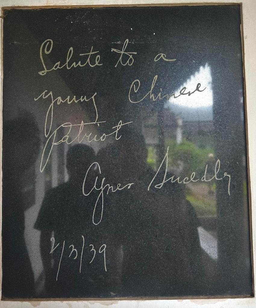 1939年史沫特萊寫給新四軍教導總隊學員葛涼的一句話語,如今也被鐫刻在石碑之上——“Salute to a young Chinese patriot(向一位年輕的中國愛國者致敬)”。
