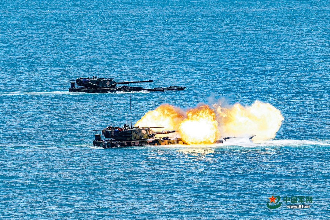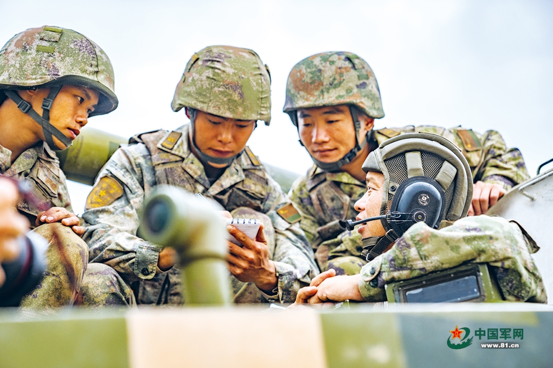 “發(fā)現(xiàn)‘?dāng)场b甲目標(biāo)!”某車車長(zhǎng)通過車載電臺(tái)向指揮所上報(bào)“敵情”,同時(shí)要求炮手做好射擊準(zhǔn)備。指揮員研判戰(zhàn)場(chǎng)態(tài)勢(shì)后,果斷下達(dá)作戰(zhàn)指令。炮手迅速瞄準(zhǔn)鎖定目標(biāo),一枚枚炮彈破膛而出。霎時(shí),海上火光沖天,硝煙彌漫。