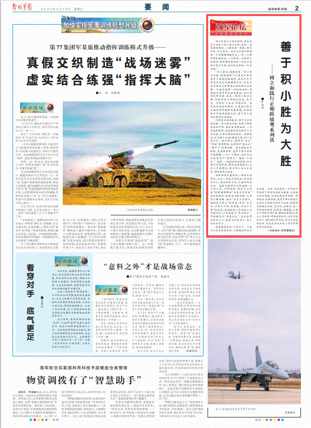 堅持謀在長遠、干在當下。小勝對應的是階段目標,大勝謀劃的是長遠發(fā)展。當前,實現建軍一百年奮斗目標到了闖關奪隘的關鍵期、吃勁奮斗的攻堅期、加油加壓的沖刺期。時間緊迫、任務艱巨,黨員干部必須善于運用積小勝為大勝的方法論,既要科學把握總目標、總方向、總要求,進一步明確任務書、時間表、路線圖,又要以只爭朝夕的干勁,搞好任務籌劃、細化工作安排、明確具體抓手,咬定目標加油干,穩(wěn)扎穩(wěn)打勇向前,努力以更高的標準、更富有創(chuàng)造性的工作開創(chuàng)強軍事業(yè)新局面。