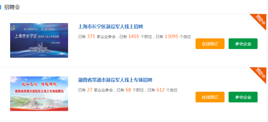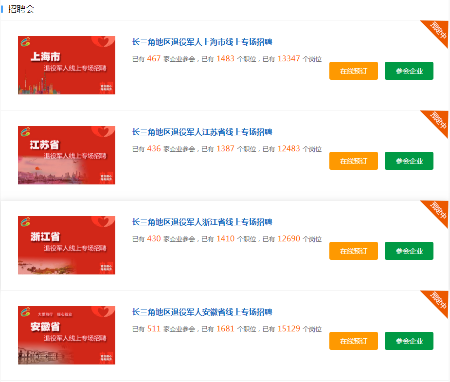 長三角地區(qū)退役軍人線上專場招聘頁面截圖