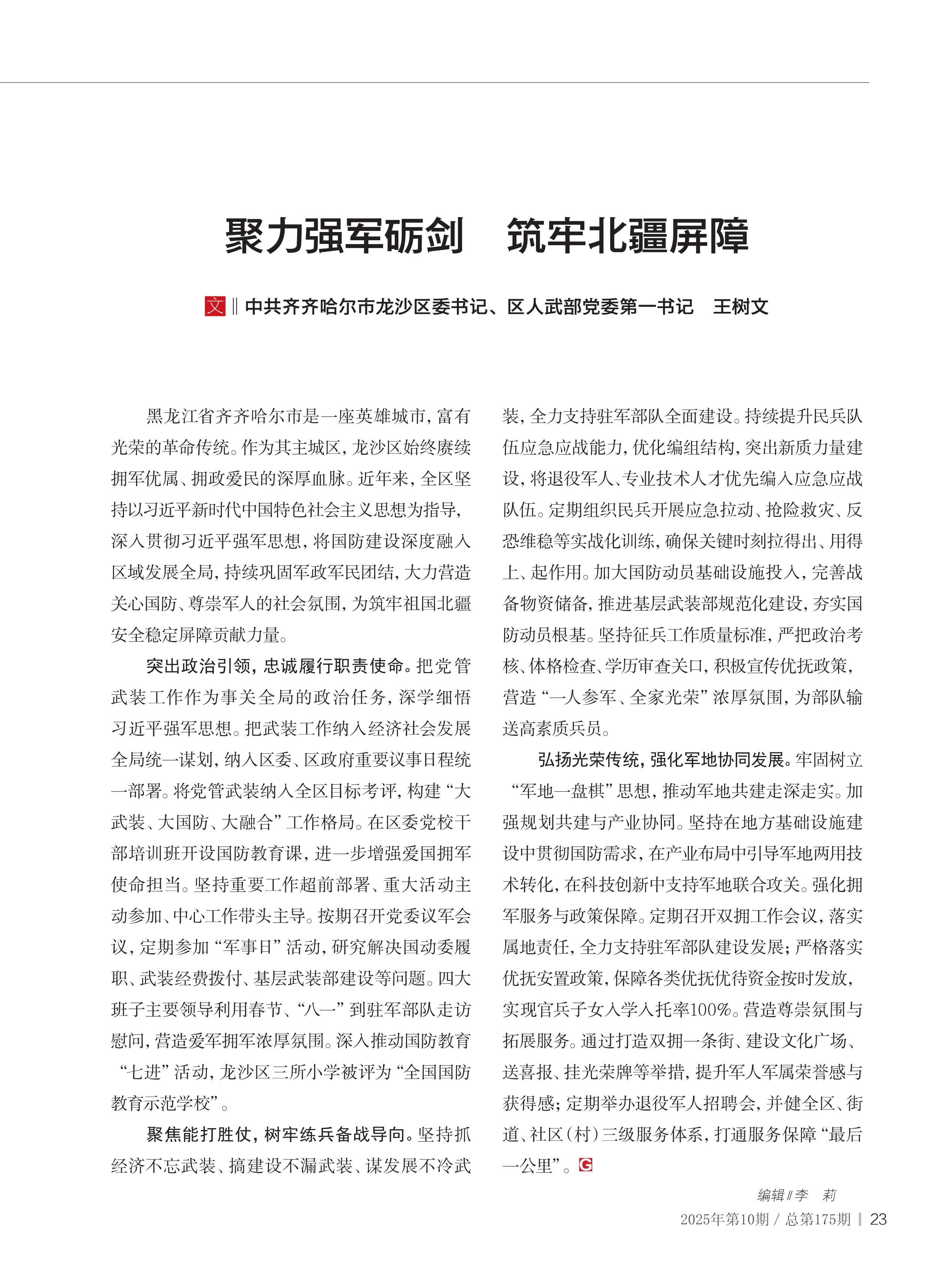 作者:中共齊齊哈爾市龍沙區(qū)委書記 區(qū)人武部黨委第一書記? 王樹文