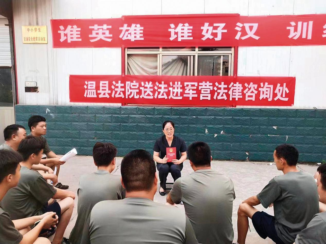 溫縣法院工作人員在“送法進軍營”活動中為官兵提供法律咨詢服務。