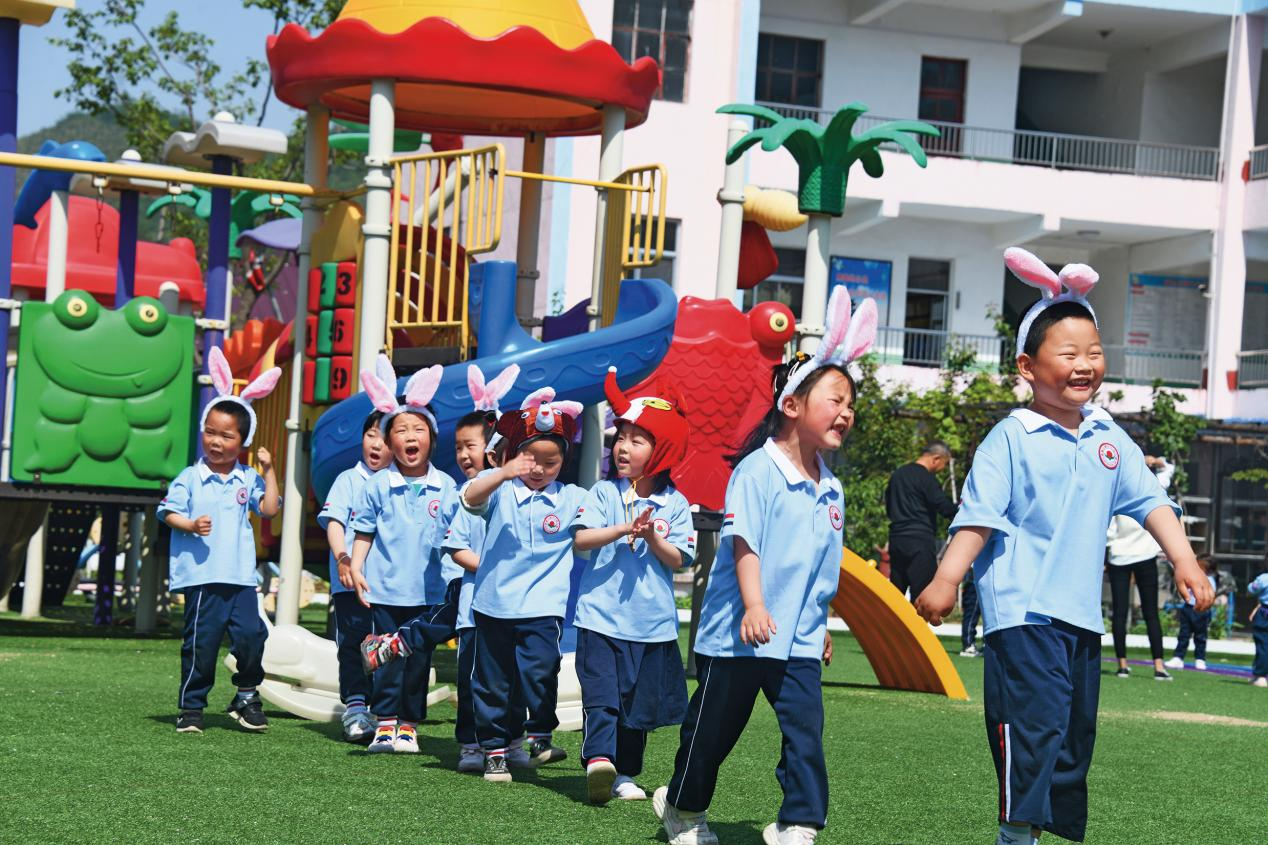 沂源縣實驗幼兒園“軍娃班”的小軍娃在課間做游戲。