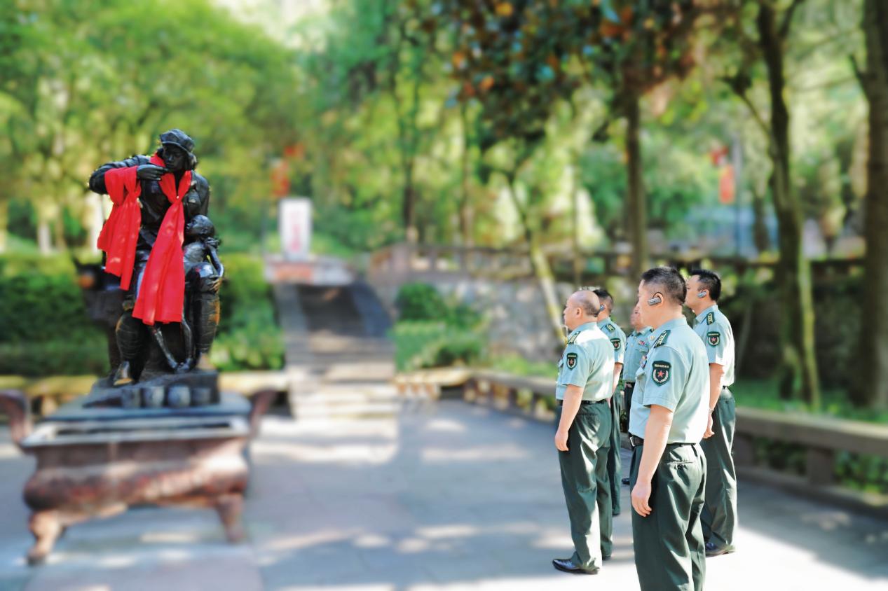 遵義軍分區(qū)領(lǐng)導(dǎo)在紅軍雕像前重溫紅色故事。(攝影/袁雅昶)