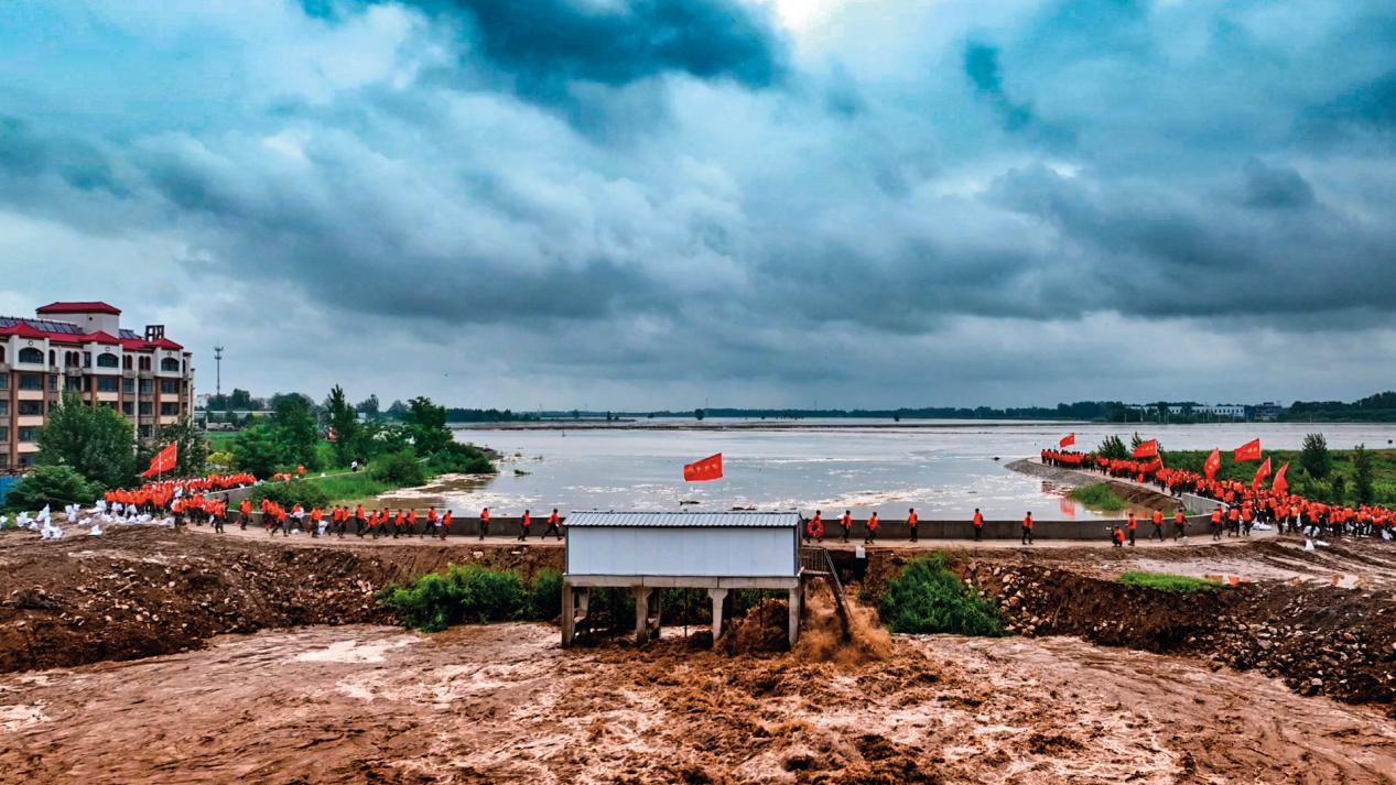 邢臺市南和區(qū)民兵應急搶險分隊和武警官兵在南澧河大堤上固堤排險。(攝影/張 明)