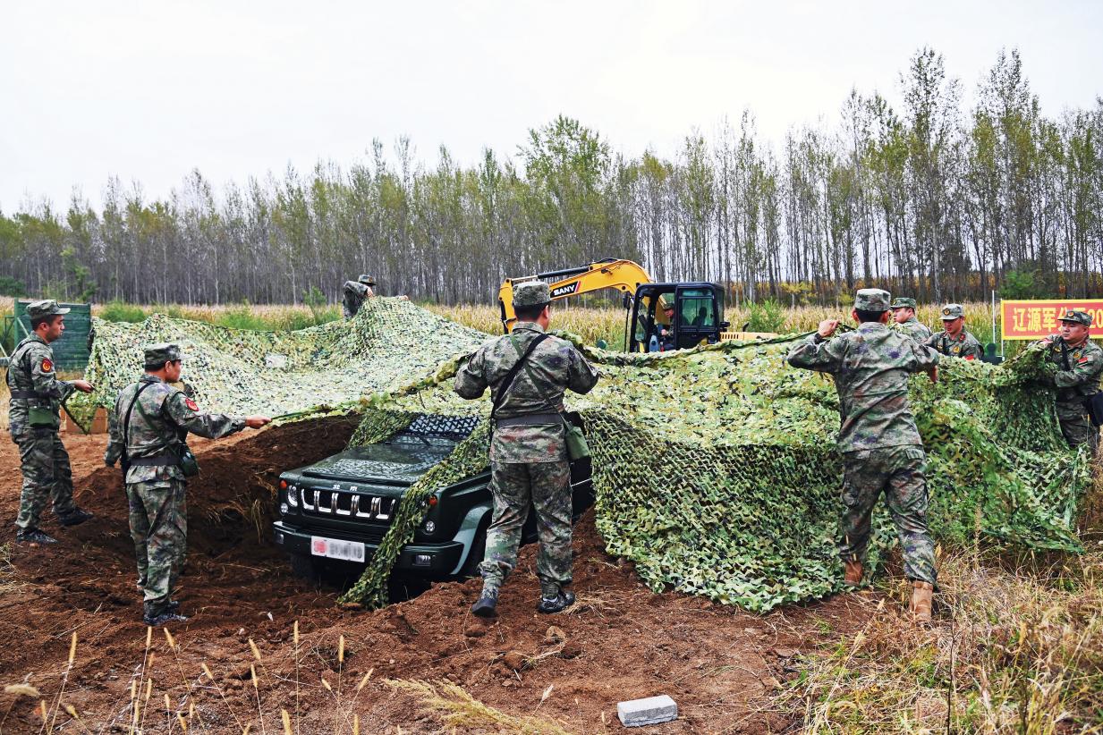 遼源軍分區(qū)組織民兵進(jìn)行車輛偽裝訓(xùn)練。