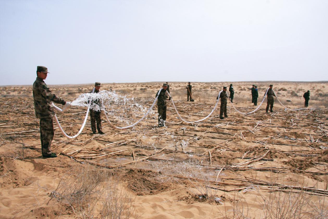 阿拉善軍分區(qū)組織官兵和民兵為新植苗木澆水。(攝影/王 鞅)