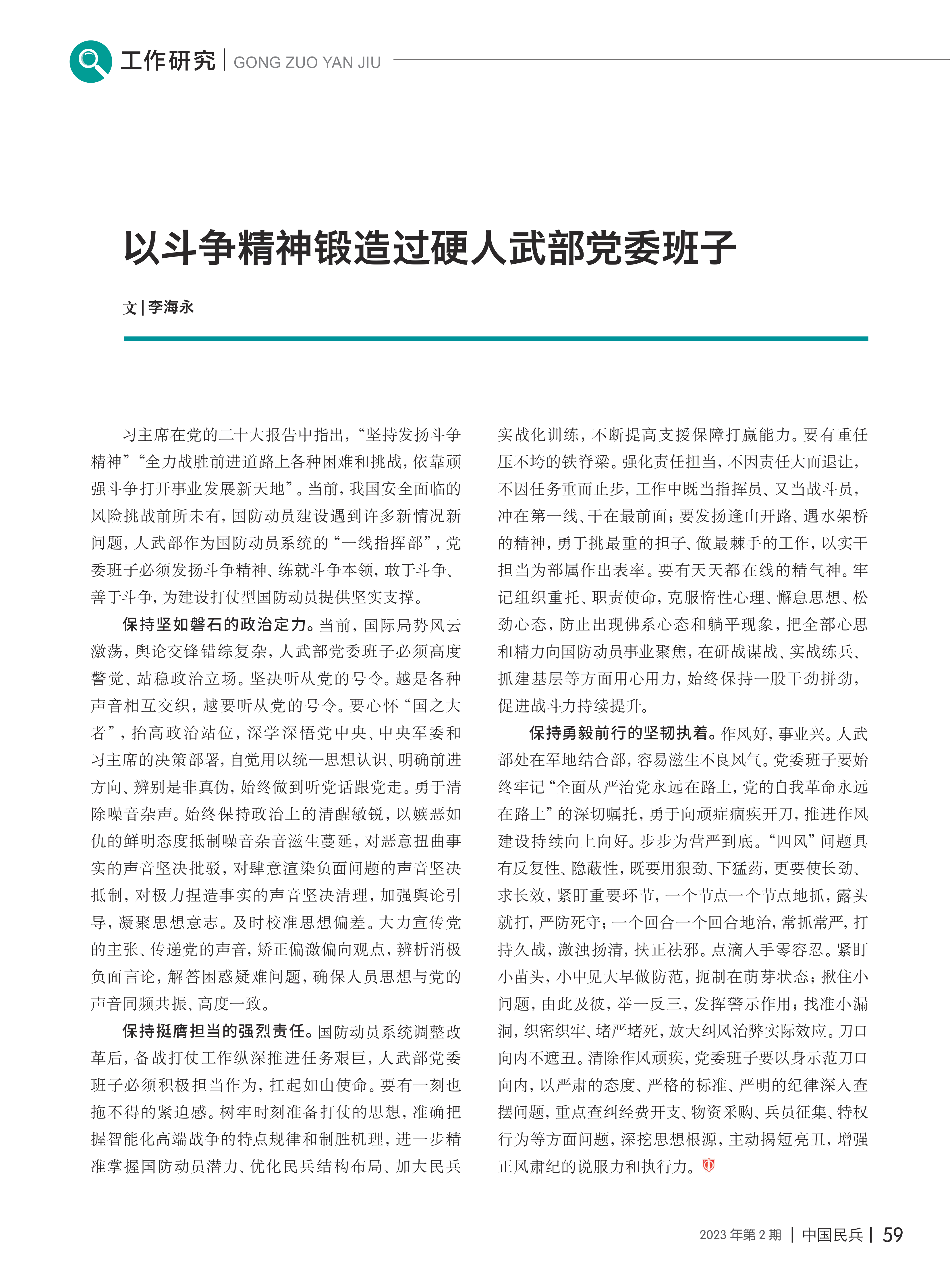 以斗爭精神鍛造過硬人武部黨委班子