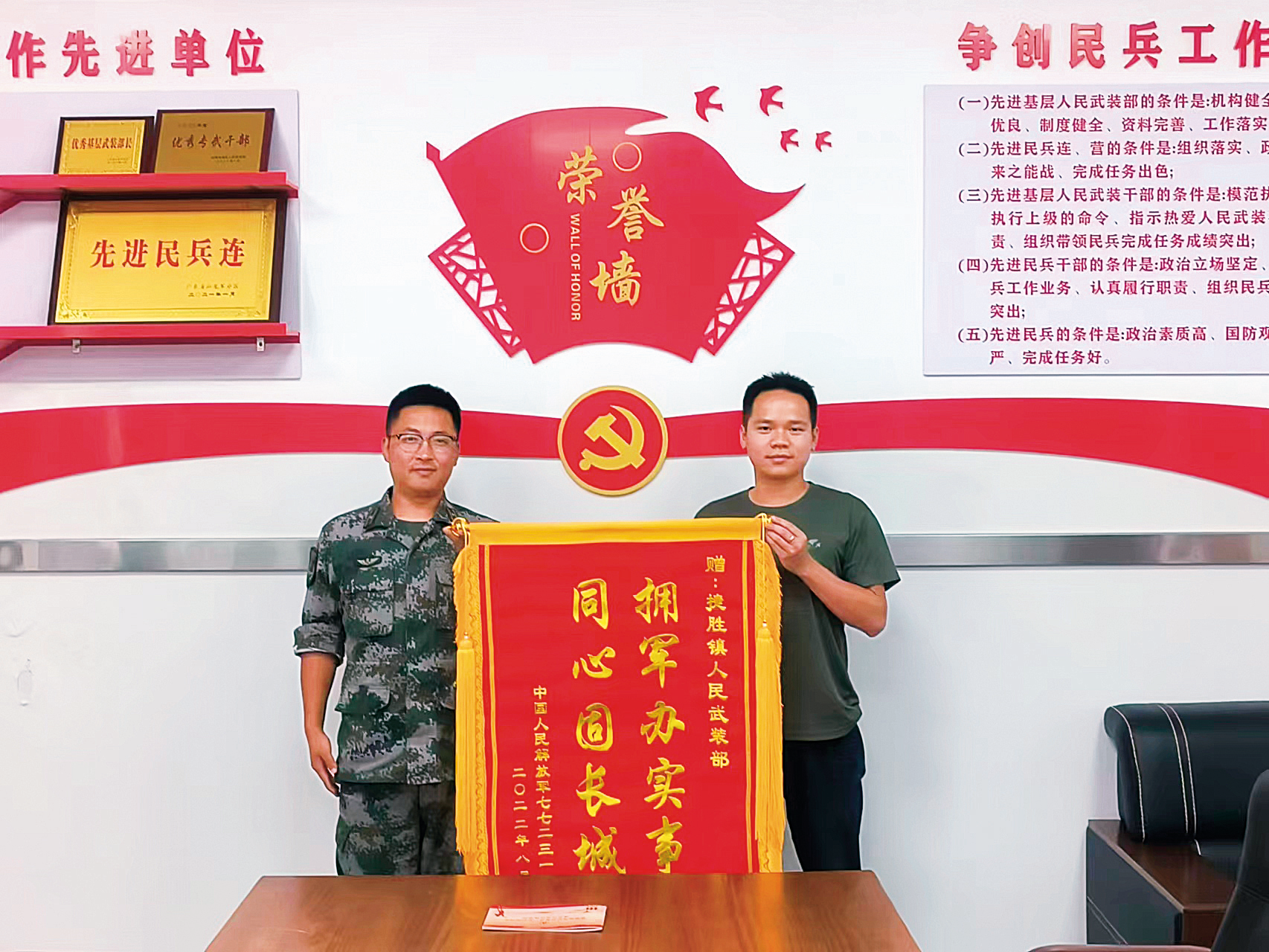 駐軍部隊(duì)向張少清所在捷勝鎮(zhèn)武裝部贈送錦旗。(攝影/彭 海)