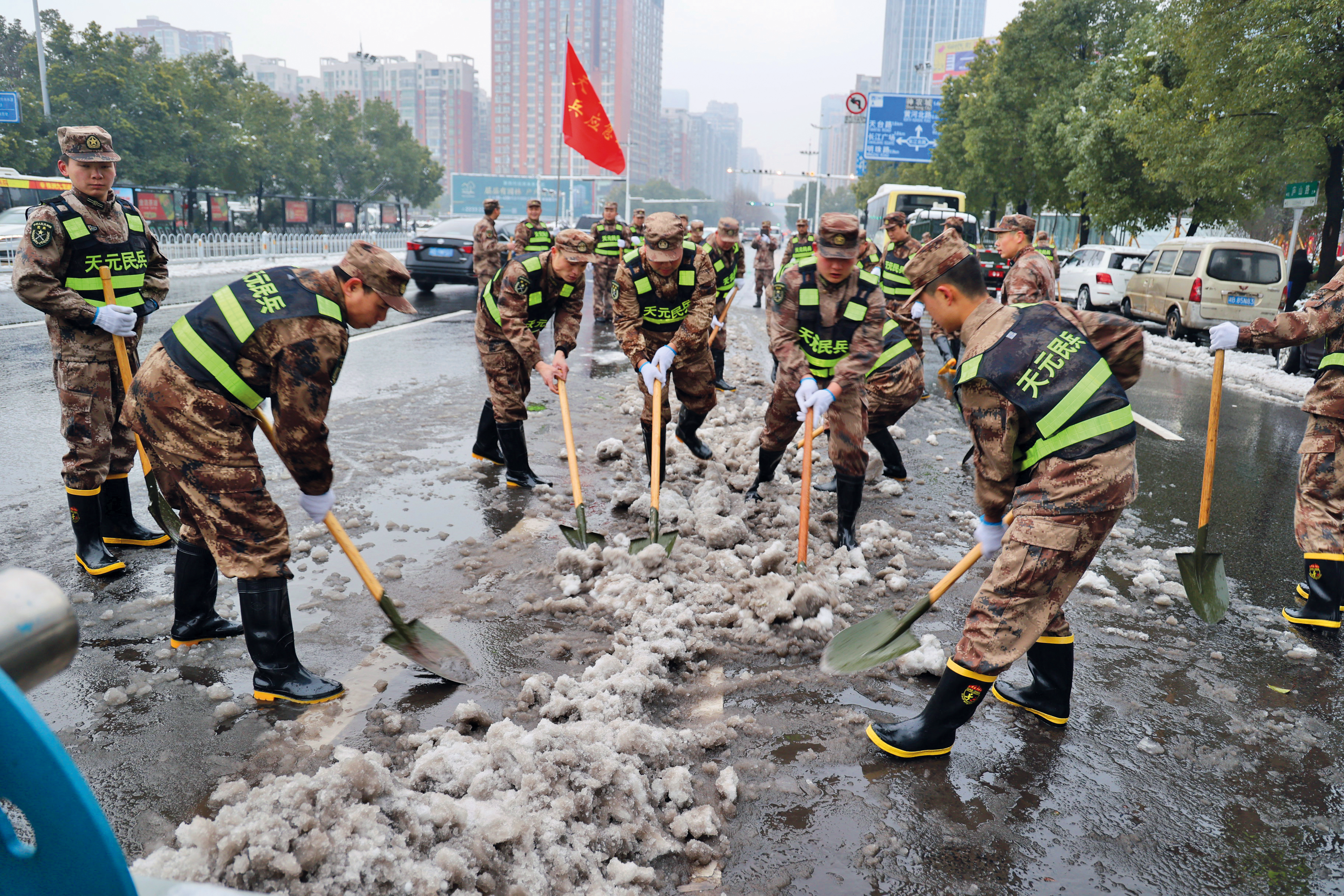 天元區(qū)人武部組織民兵清掃街道積雪。 (攝影/劉文武)