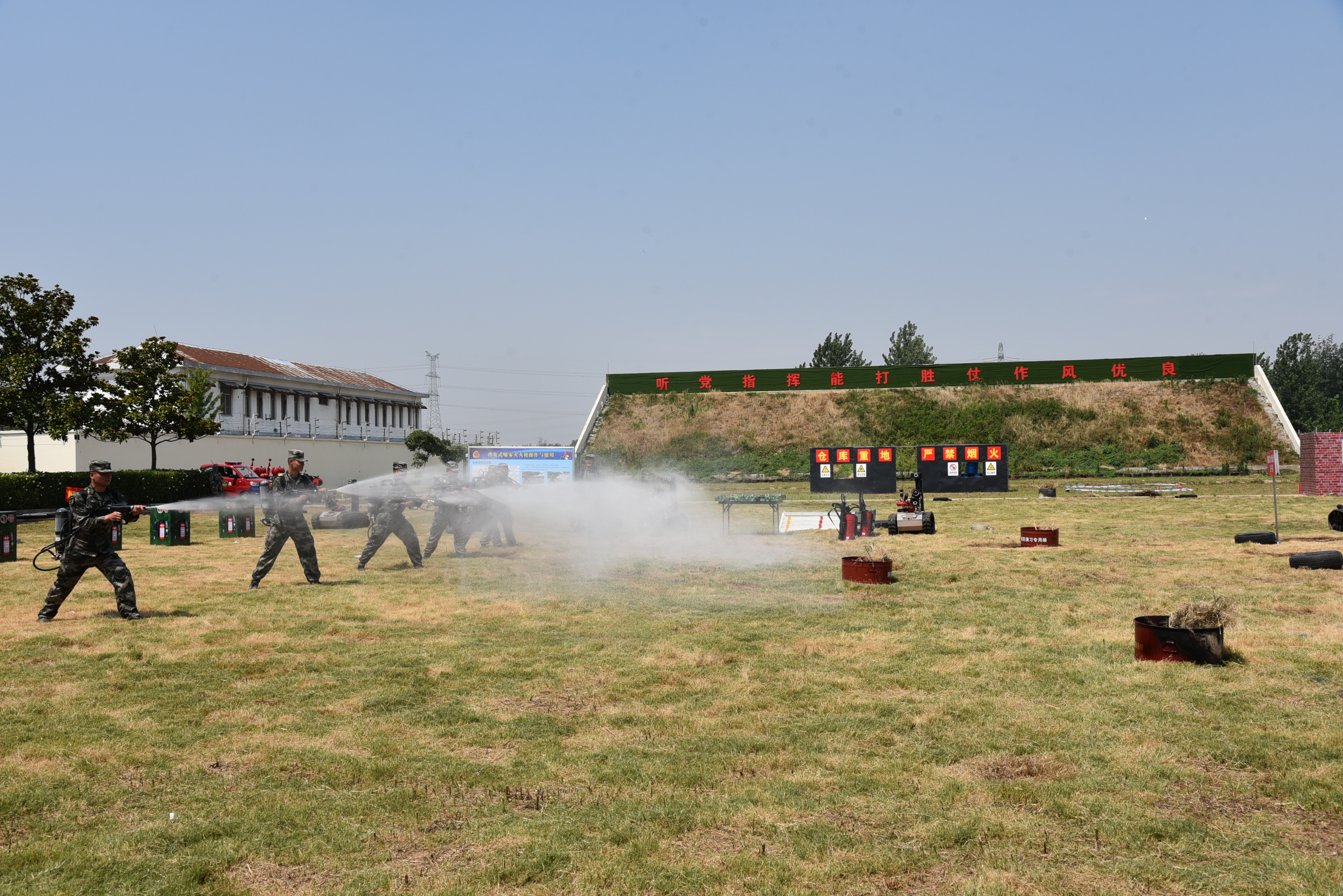 徐州軍分區(qū)組織民兵進行“滅火器材操作與使用”課目教學。 (攝影/程壽山)