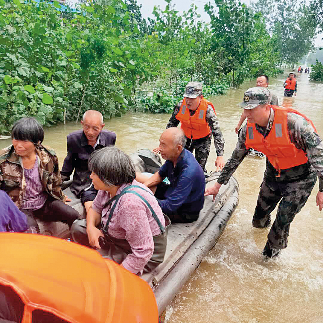 淮濱縣人武部人員在參加淮河抗洪搶險中轉(zhuǎn)移受困群眾。周昌友 攝