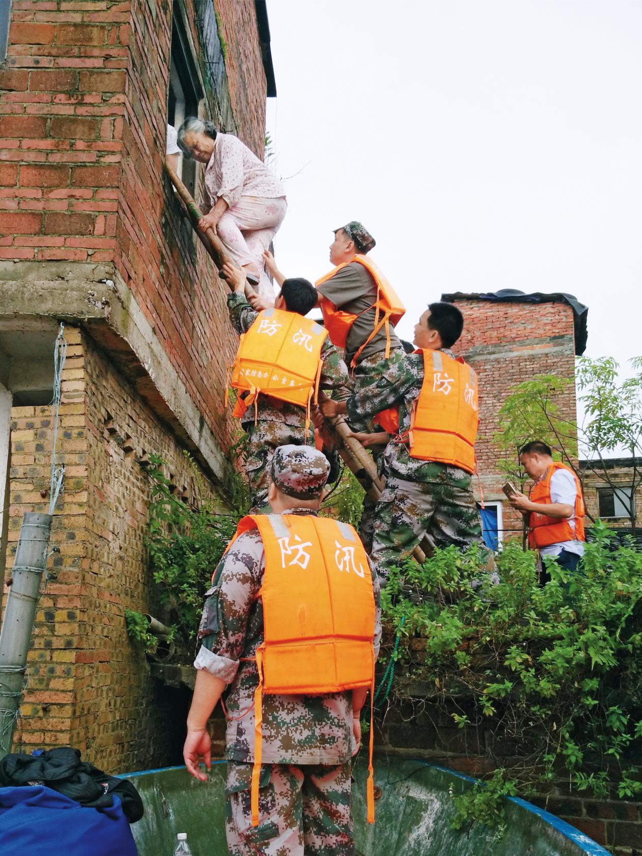 貴港軍分區(qū)組織民兵應急分隊轉(zhuǎn)移被洪水圍困群眾。(攝影/張 巖)