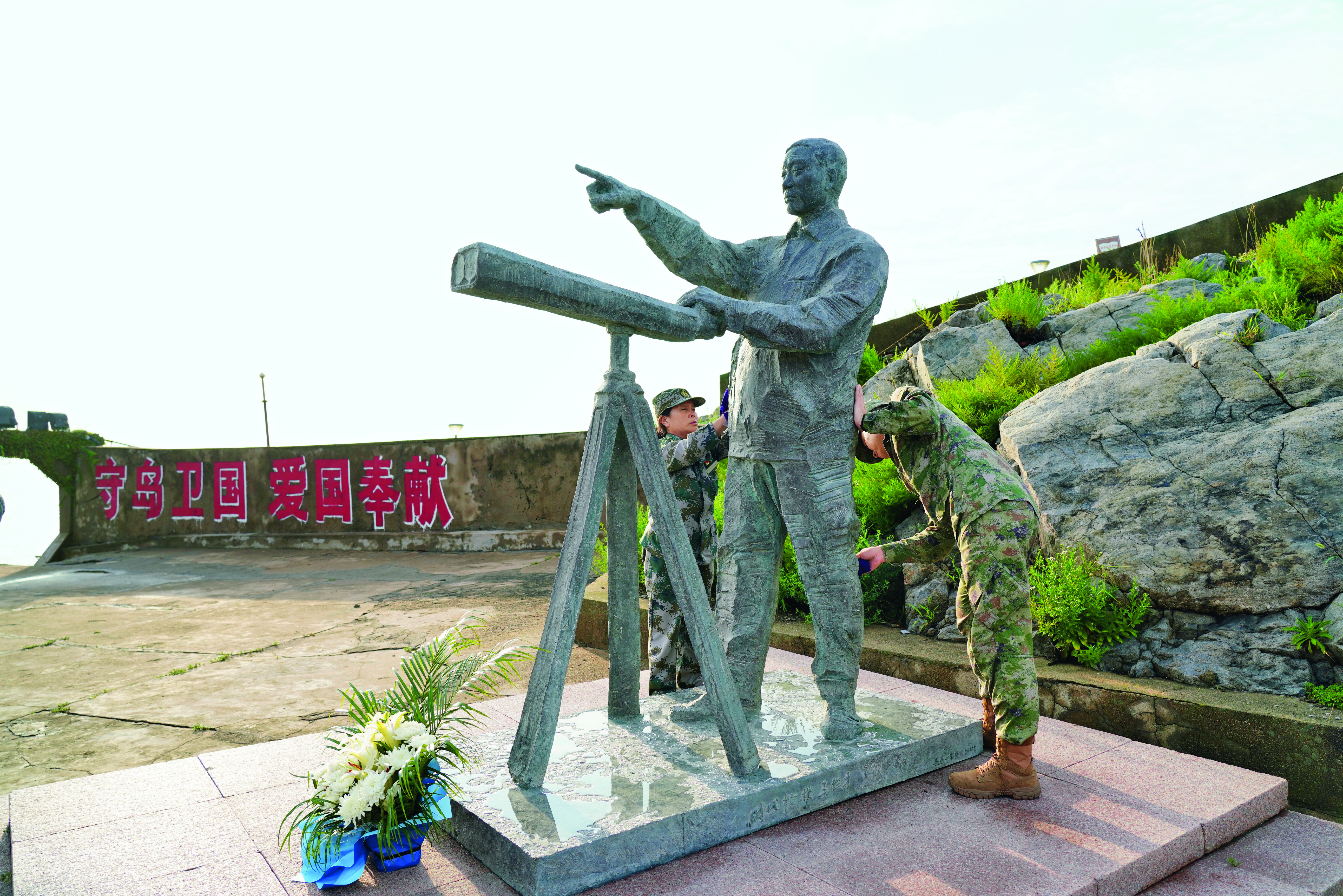 王仕花和守島民兵擦拭王繼才銅像。(攝影/李弘非)