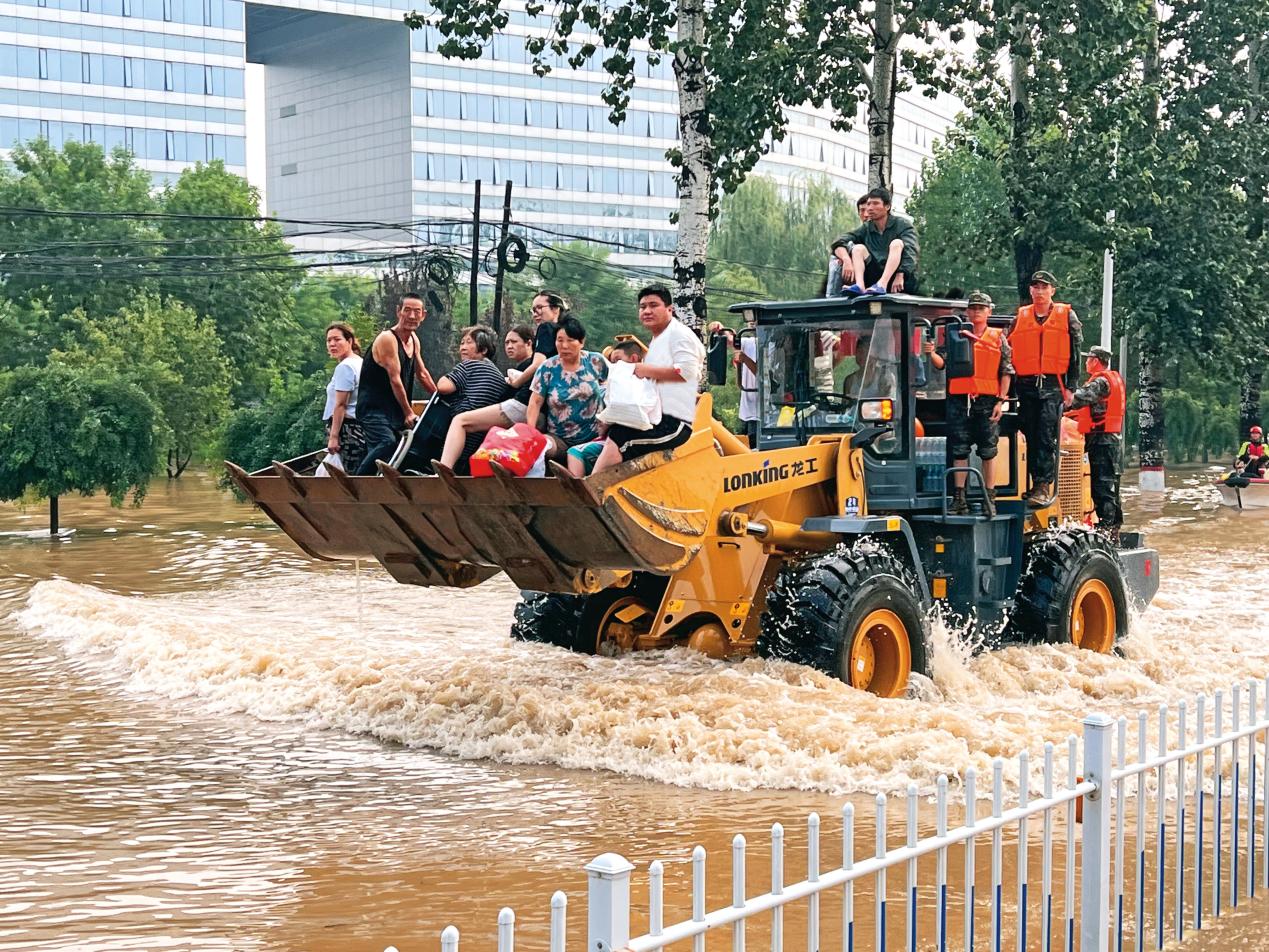 河北省軍區(qū)組織民兵利用沖鋒舟、鏟車等裝備在涿州市碼頭鎮(zhèn)轉(zhuǎn)移受困群眾。(攝影/蘇英凡)