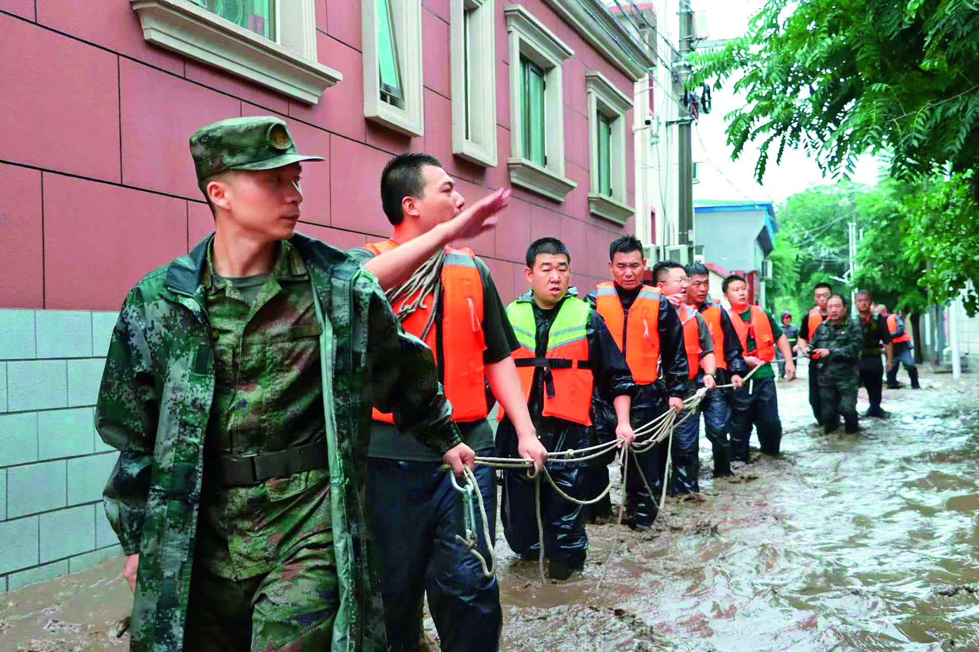 7月31日,河北省軍區(qū)設(shè)立前進(jìn)指揮部,出動挖掘機(jī)、沖鋒舟、卡車等大型機(jī)械設(shè)備,連夜加固河流堤壩,搜救轉(zhuǎn)運受困群眾。