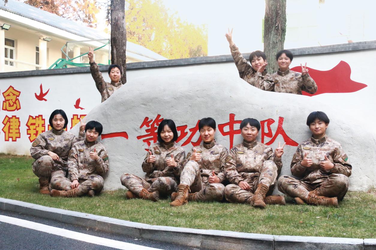通信中隊(duì)女兵訓(xùn)練間隙在刻有“一等功中隊(duì)”字樣的“勵(lì)志石”前合影。(攝影/沈 晨)