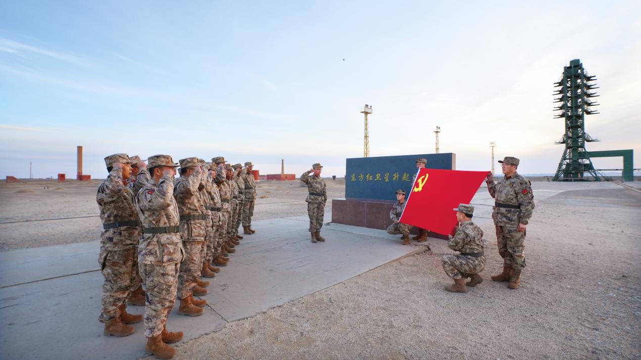 金塔縣航天民兵連黨員民兵在東方紅衛(wèi)星升起的地方重溫入黨誓詞。