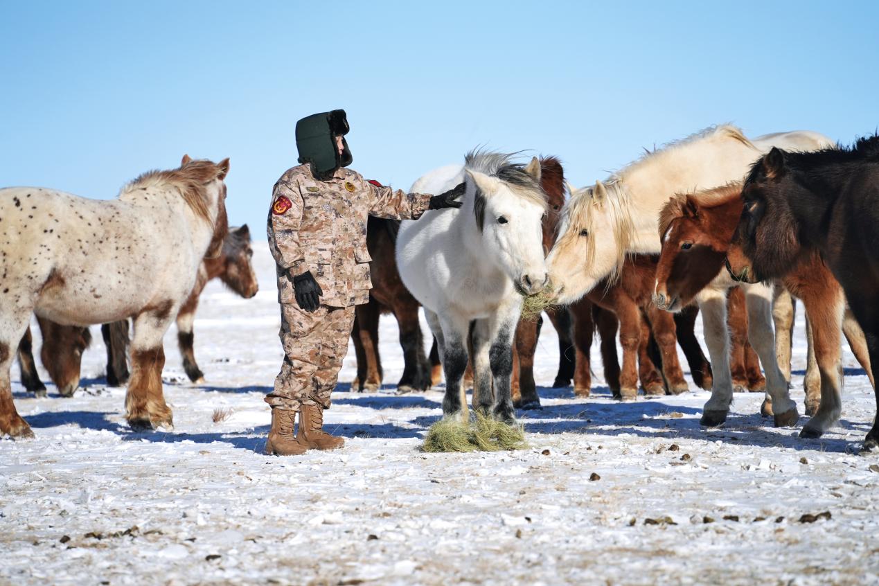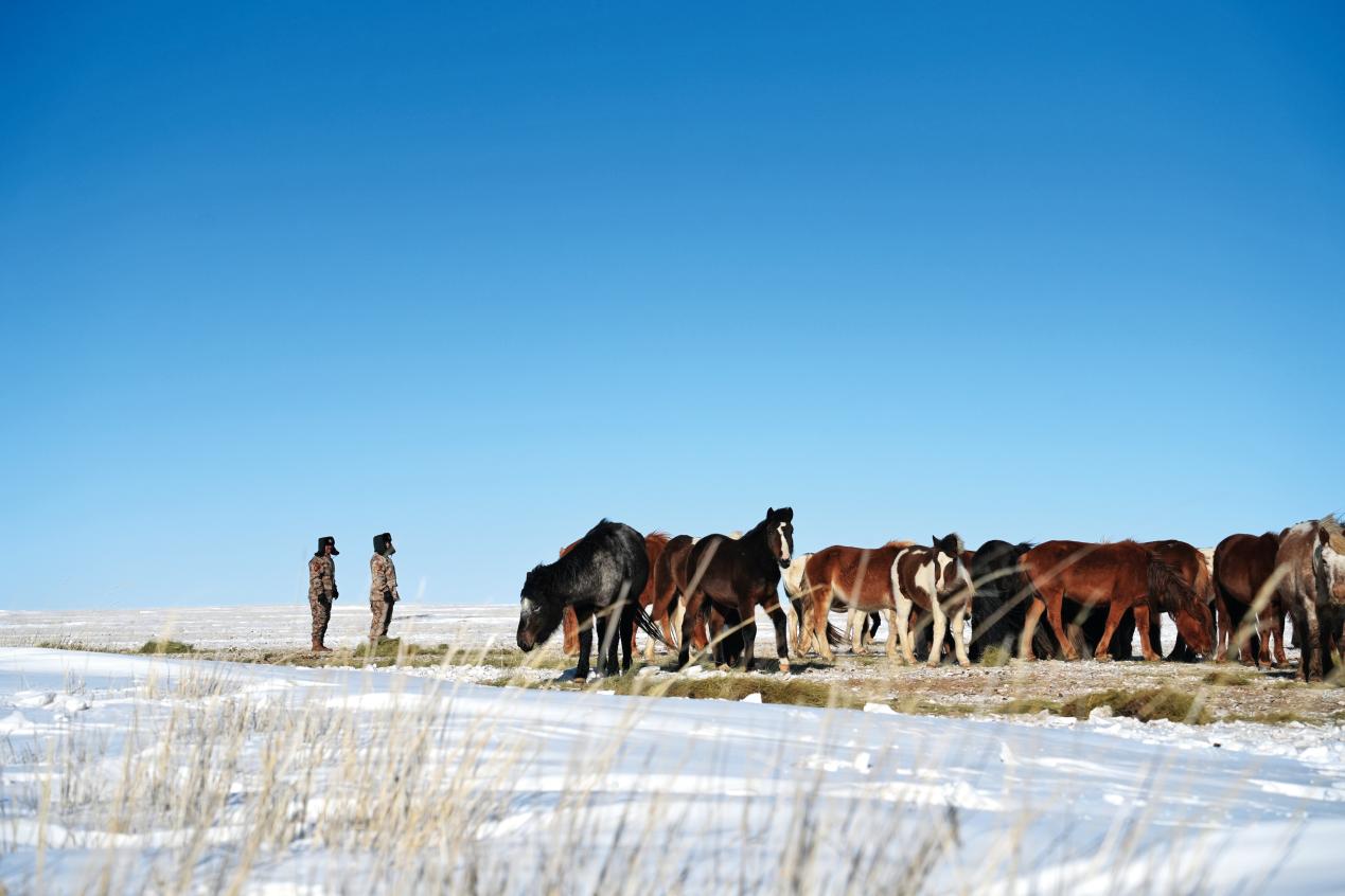 入冬不久,北疆的草原深處已經(jīng)下了好幾場大雪,天地間白茫茫一片。地面的道路深埋在厚厚的積雪之下,“白毛風(fēng)”卷起雪粒打在臉上刀割般地生疼。在這種天氣下,軍馬就成了軍人戍邊巡邏途中相依相靠的“無言戰(zhàn)友”。