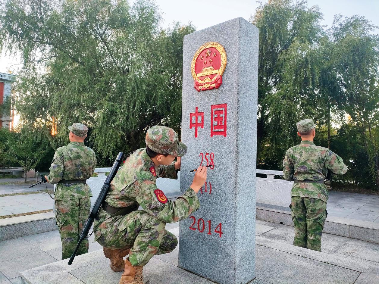 東極民兵連民兵利用換崗間隙對界碑進(jìn)行擦拭和描紅。