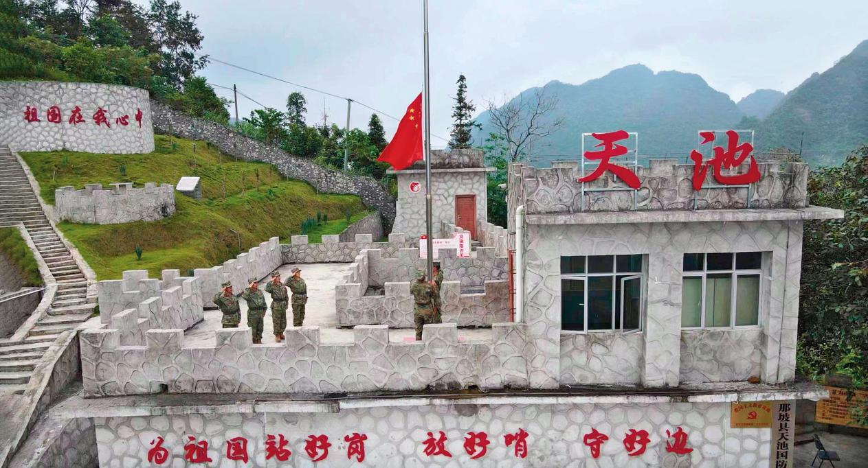 天池國防民兵哨所民兵舉行升國旗儀式。